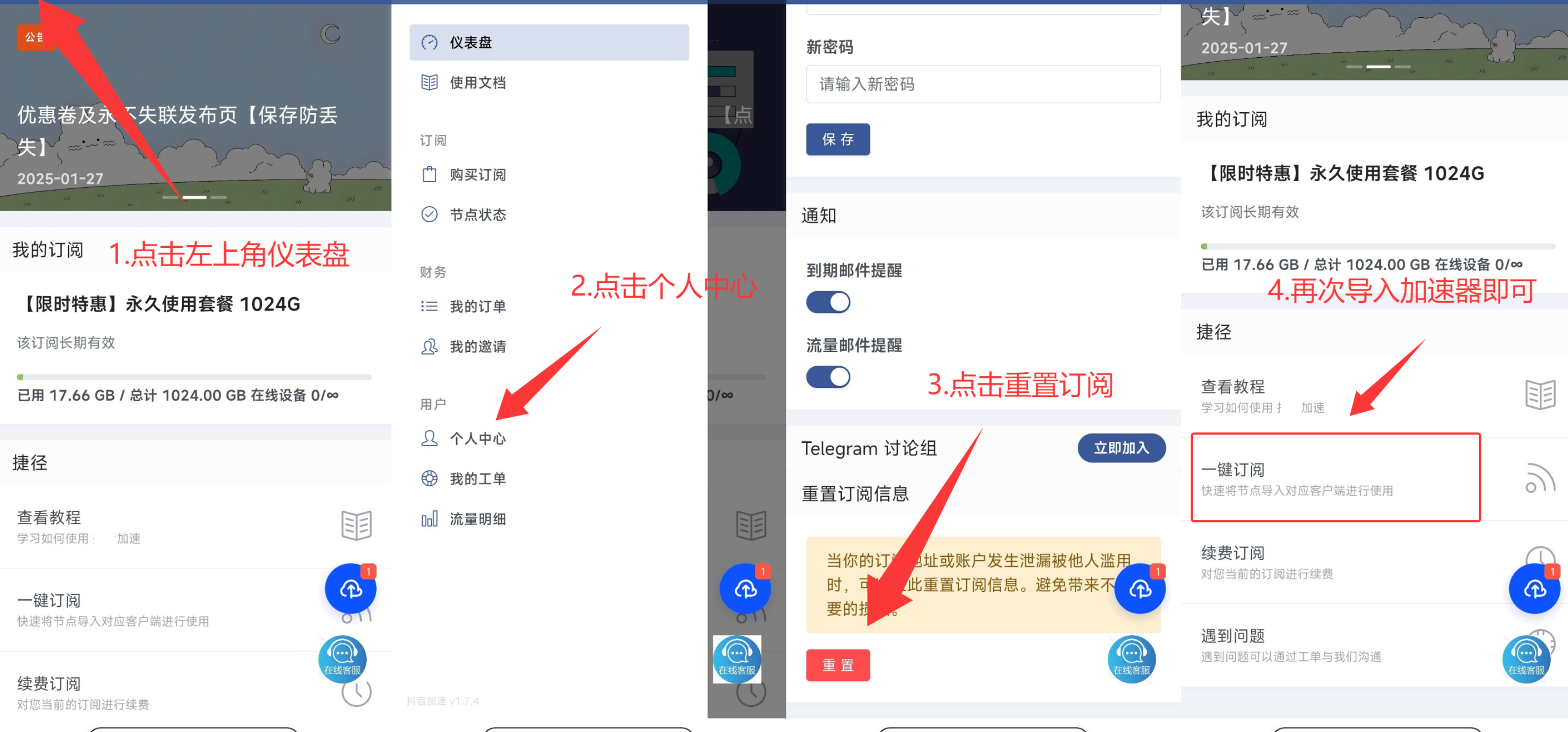 > 问:为什么无网络?为什么节点用不了? > > 答:这通常是是因为最新订阅地址变更,用户没有及时更新导致节点没有更新到最新订阅地址 > >为了您的网络体验,请养成经常更新节点的好习惯 > >解决方法1:每次使用前请更新一下订阅 > > > 解决方法2:登录官网重置订阅地址并且重新导入 > >官网内点击仪表盘个人中心-拉倒最底端-点击重置订阅-再次导入加速器即可 > >